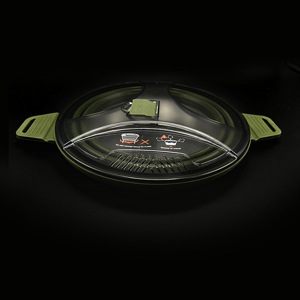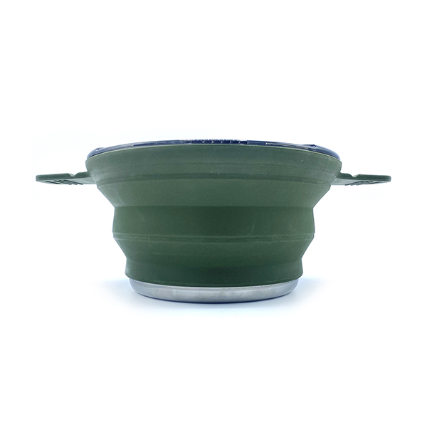 The Wolf Outdoors EzyStow Silicone Cooking Pot collapses to a compact size, allowing for easy storage and transport in a backpack or travel gear.