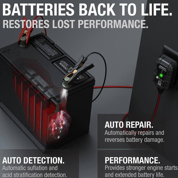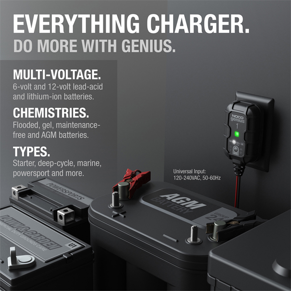 Introducing the all-new GENIUS1, one of our most powerful, highest-performing, energy-efficient, and compact chargers yet. The GENIUS1 is a 6-volt and 12-volt battery charger, battery maintainer, and battery desulfator rated at 1-amp for lead-acid automotive, marine, and deep-cycle batteries, including flooded, gel, AGM, and maintenance-free, plus lithium-ion batteries.