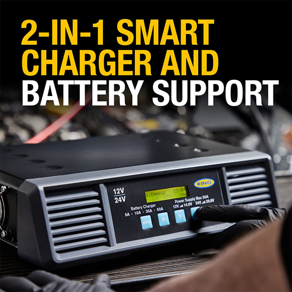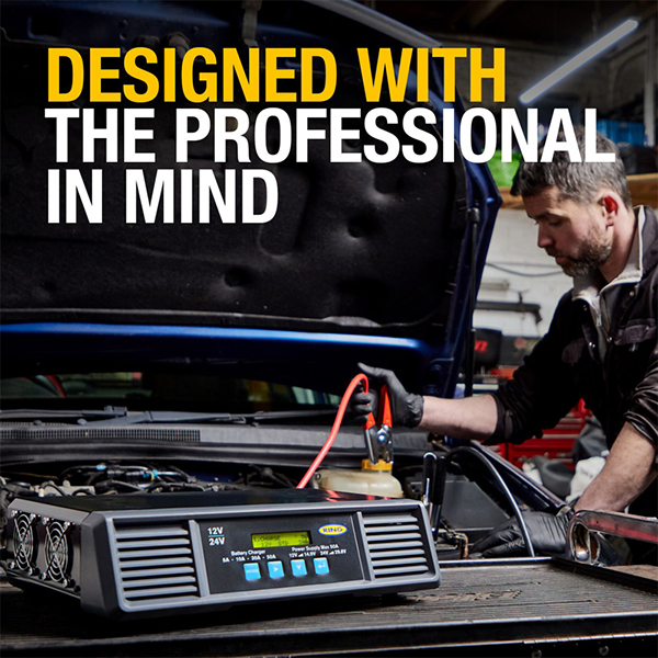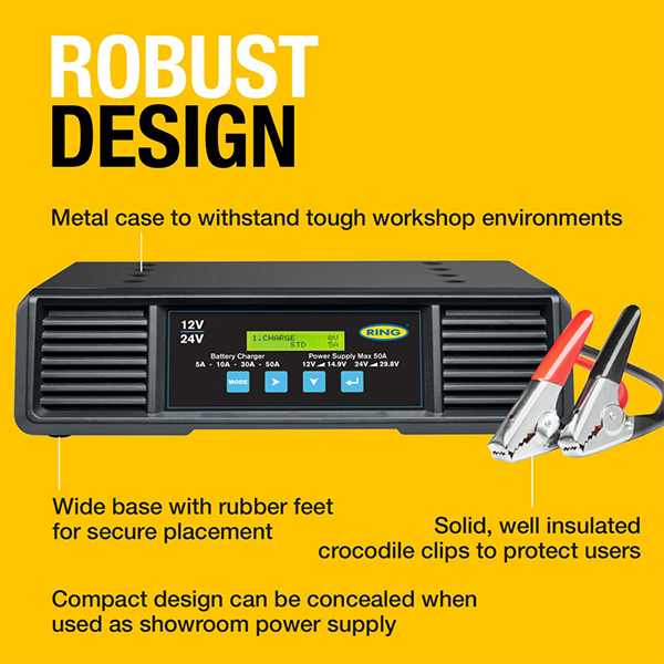 50A smart battery charger with multiple charge rate settings. A complete battery support unit suitable for 12V and 24V vehicles with mixed battery types including Lithium and START/STOP. Slimline light ideal for intensive use with fleets of mixed vehicles in garages workshops and showroom environments. With heavy duty removable clamps. Using the power supply function maintain a constant battery voltage level at both 12V & 24V for when appliances or programming & vehicle diagnostic equipment is connected and drawing power. Multi-chemistry and charging level selection allow the user to set the specific charge required for different battery types. Test functions provide battery and alternator diagnosis. With LCD display and an easy to navigate menu system. Featuring smart charge technology which optimises battery performance and improves the ability to hold charge. Two dedicated charging curves seven stage for Lithium batteries and nine stage for all other chemistries optimising the battery performance and improving the ability to hold charge.