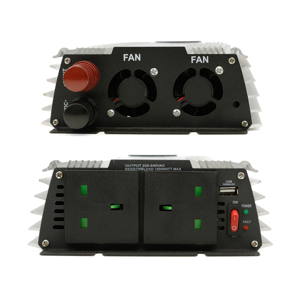 For drivers, caravaners, campers and tradespeople who need access to a power supply when they are in a remote area, on site or where there is restricted access to a power supply. This 1500W (3000W peak) modified sine wave inverter safely converts the vehicle’s 12V DC battery to a 230V AC power supply. Suitable for powering UK standard appliances of that requires up to 15000W. This includes laptops, mobile phones, LCD TVs, DVD players, cordless power tool chargers, corded power tools and more. The inverter comes in an anodized aluminium case with a built-in cooling fan to protect against overheating. Compatible with most 12V cars, 4x4s, lorries and motorcycles. And it is also suitable for most caravans, motorhomes and boats. The inverter is powered through the vehicle’s battery, and the product is supplied with battery connector cables to connect the inverter to the 12V battery. The inverter works with the vehicle's battery when the engine is turned either on or off.