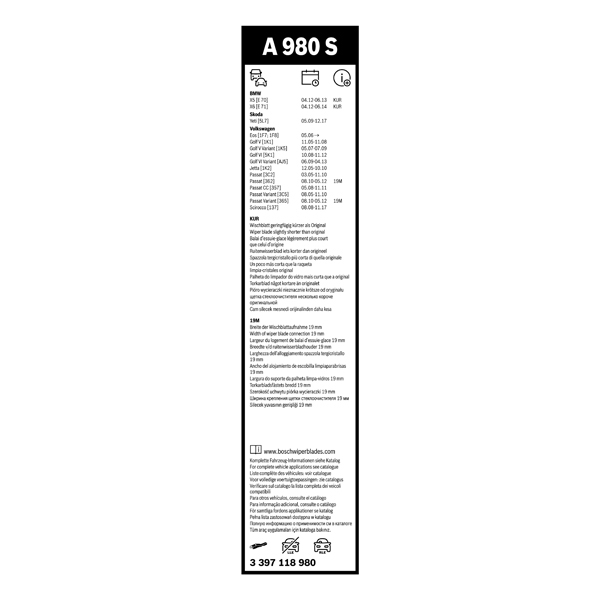 Bosch Aerotwin Flat Wiper Blade Set A980SProduct Code: 485774750