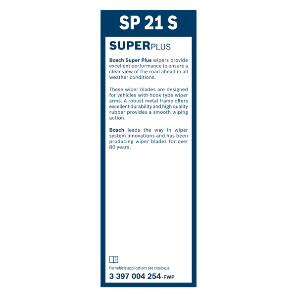 Bosch SuperPlus Spoiler SP21S - Front Windscreen Wiper Blade - Comes with Pre-assembled Quick-Clip Adapter - 1 Blade, 530mm. Excellent wiping performance in any weather. Increased service life due to Power Protection Plus. Silent operation on both wet and semi-dry windscreens. Aerodynamic design: Stops lifting and vibrations through reduced windage for improved driver comfort and high speed. Quick and easy installation due to pre-assembled adapter.
