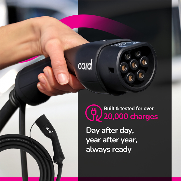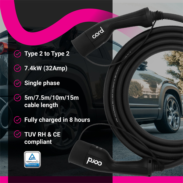 CORD EV Charging Cable - 15m Type 2 to Type 2, 230V 32A 7.4kW, Single Phase