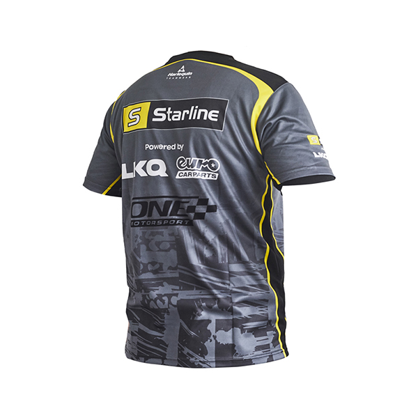 British Touring Car Championship t-shirts are made from 100% polyester, and combine innovation with comfort. They are durable and breathable, with moisture-wicking properties, and vivid sublimation print allows for the team to showcase it's branding, in a garment designed for the high-performance environment of the motorsport garage, as worn by the teams mechanical and engineering staff.
