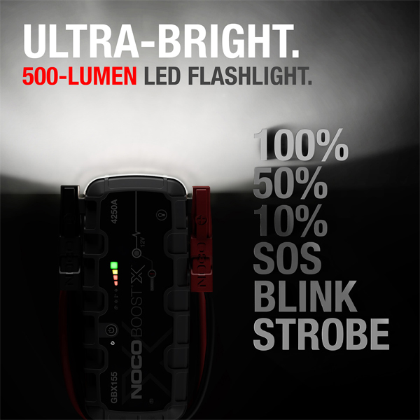 NOCO Boost X GBX155 is a portable lithium jump starter for 12-volt batteries in vehicles up to 10.0-liters gasoline and 8.0-liter diesel engines, including cars, motorcycles, trucks, ATVs, boats, RVs, vans, SUVs, tractors, and more.