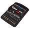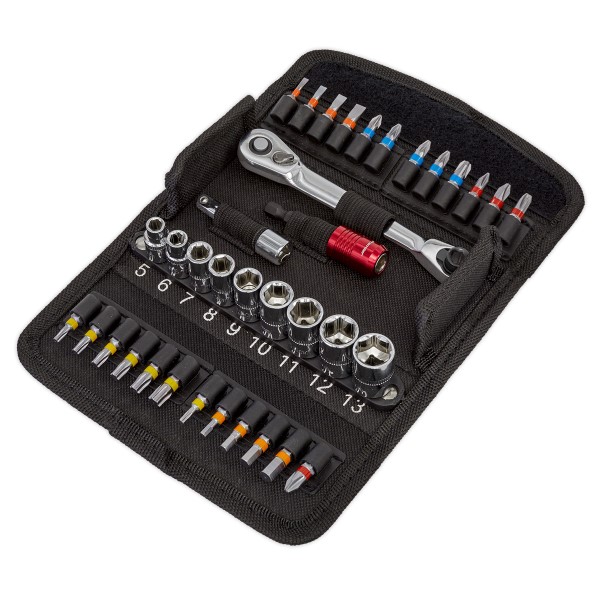 Everyday grab a suprise tool to make a complete Socket & Bit set in time for Christmas - Ideal presents for any tool & DIY lover! Made from high quality Chrome Vanadium steel.Features an ultra smooth 72-tooth double ended ratchetwrench combining 1/4"Sq and 1/4"Hex drives.Fully polished mirror finish sockets with knurled rings.Forged S2 steel colour-coded bits with a satin chrome finish.Includes quick release bit holder and 50mm extension.Compact textile storage case.