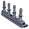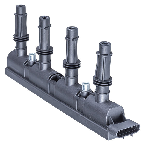 An ignition coil transforms the battery's 12 volts to thousands of volts needed to produce a spark to the spark plugs.